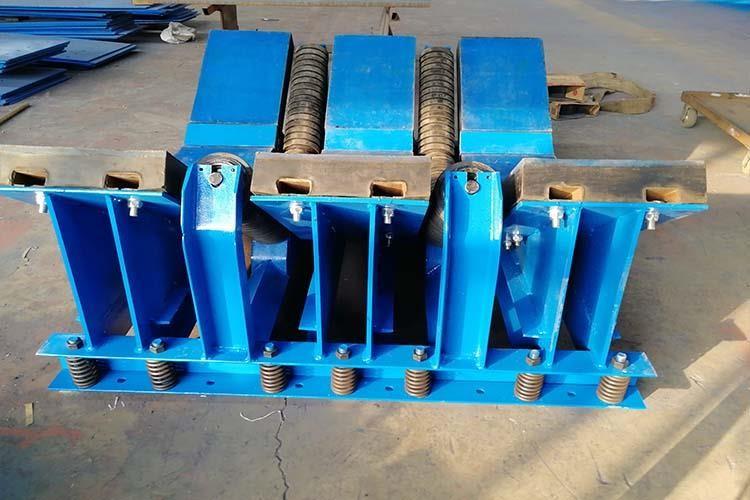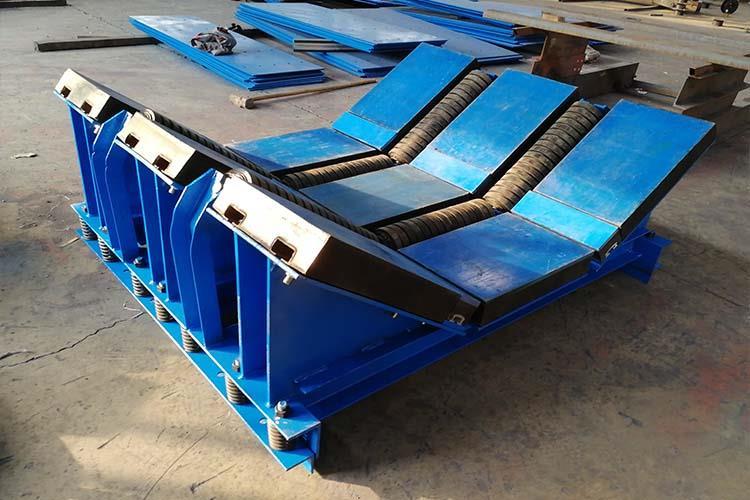 皮帶機緩沖床主要用于皮帶機導料槽下方的落料口處,當物料下落時,緩沖床利用自身彈性對物料下落到皮帶上的沖擊力進行處理,使沖擊力達到很小,以保證皮帶機正常運行。皮帶機緩沖床的表層緩沖條擁有五百萬分子量的高分子聚乙烯板面,該高板于皮帶呈面面接觸,使?jié)櫥赃_到很高,摩擦系數(shù)降至很低。