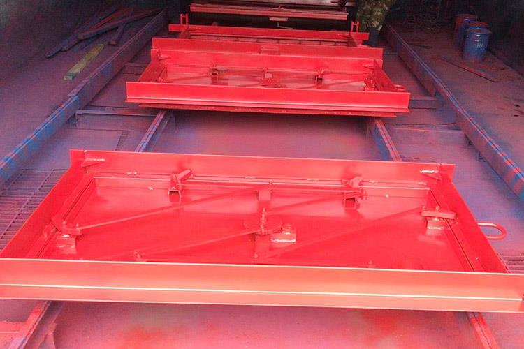 避難硐室密閉門使用對稱的方式進(jìn)行安裝,它的每一個(gè)安裝件都是使用鋼材料來焊接成的。避難硐室密閉門的門扇是由井字結(jié)構(gòu)來進(jìn)行焊接的,反風(fēng)的主要裝置是采用鋼管來插拴的,安裝的時(shí)候在合頁處涂上潤滑油,保證使用的靈活性。斜風(fēng)井防爆門關(guān)門時(shí),各部件反向擺動(dòng),到關(guān)閉狀態(tài)時(shí)成矩形狀態(tài)。